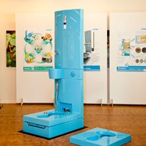 Die Zusammenarbeit des Schweizer Wasserforschungsinstituts Eawag und des Designbüros EOOS ist eine ungewöhnliche aber auch notwendige Kooperation, wenn es darum geht, zukunftsweisende Technik in eine alltagstaugliche Form zu bringen. So entstand in intensivem Austausch zwischen Wien und Zürich im letzten Jahr die „diversion toilet“: Eine Hock-Toilette, die Urin und Fäkalien trennt, sauberes Wasser zum Hände waschen und reinigen der Anlage bietet, keinerlei Kanal- oder Wasseranbindung bedarf und vor Ort produziert werden kann. Produktion und Betrieb der Anlage kosten 5 Cent pro Tag und pro Person. Unangenehme Gerüche können dank eines raffinierten Verschlusssystes vermieden werden. Darüber hinaus wird ein ganzheitliches Servicekonzept vorgestellt, das dieses System dauerhaft implementieren und Arbeitsplätze schaffen soll.