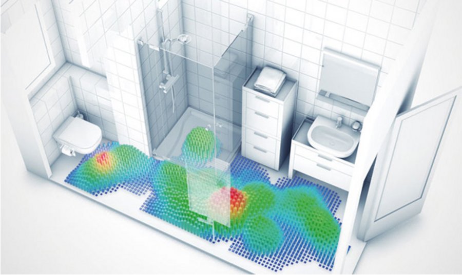 Um das Verhalten im Badezimmer überwachen zu können, übrigens zum ersten Mal in einer Badezimmerstudie, haben wir einen Prototyp für die Bewegungserfassung konstruiert. Pro Badezimmer erfassten zwei speziell angepasste Tiefensensoren präzise die Körperbewegungen in drei Dimensionen. Auf diese Weise konnten bis zu vier Badnutzer gleichzeitig erfasst werden. Der Einsatz mehrerer Sensoren stellte sicher, dass auch nicht-einheitliche Räume überwacht werden konnten.