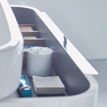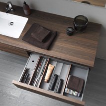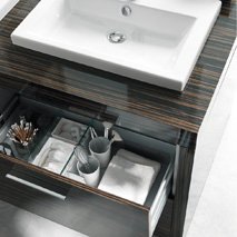 Ein besonderes Innenleben für Schubladen bieten die Badmöbelserien Delos und Happy D.2. Um den Stauraum optimal zu nutzen gibt es verschiedene Unterteilungsmöglichkeiten: Zwischen schmalen Holzabtrennungen aus Ahorn oder Nussbaum befinden sich rutschfeste Einleger in Diamant-Schwarz. Diese garantieren, dass Badutensilien an ihrem Platz bleiben. Wellenförmige Bords in unterschiedlichen Breiten bieten Kosmetikartikeln oder Bürsten komfortable Ablageflächen. Passende Boxen mit und ohne Deckel lassen Wattestäbchen oder Ähnliches dezent verschwinden.
