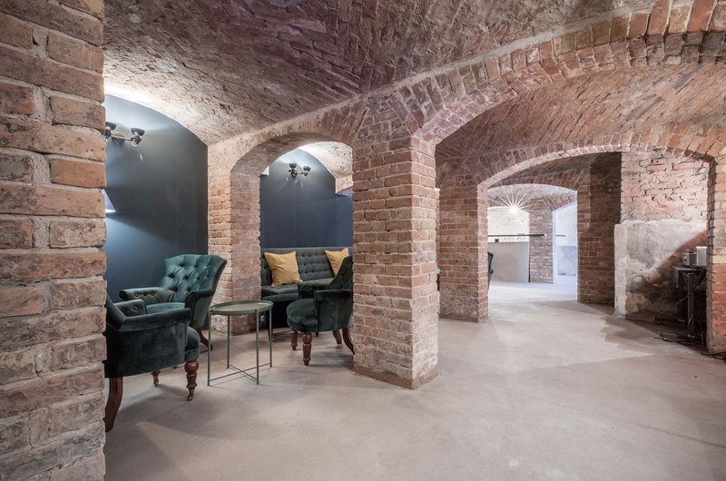 Optisches Highlight der Kunst- und Event-Location ist der 66 Quadratmeter große Backstein-Gewölbekeller, der den Barbereich beherbergt. „Wir kontrastieren den rustikalen Charme der roten Steine und des blanken Betonbodens mit edlen Chesterfield-Sesseln und -Sofas“, erklärt Kanya. Die Bar, die durch einen neuen Lichtschacht inzwischen auch Tageslicht erhält, erinnert dadurch an einen britischen Members-Club. Die Gestaltung der beiden angrenzenden Ausstellungsräume ist dagegen schlicht. Betonböden und weiße Wände bieten eine zurückhaltende Kulisse, vor der sich Kunstwerke entfalten können.
