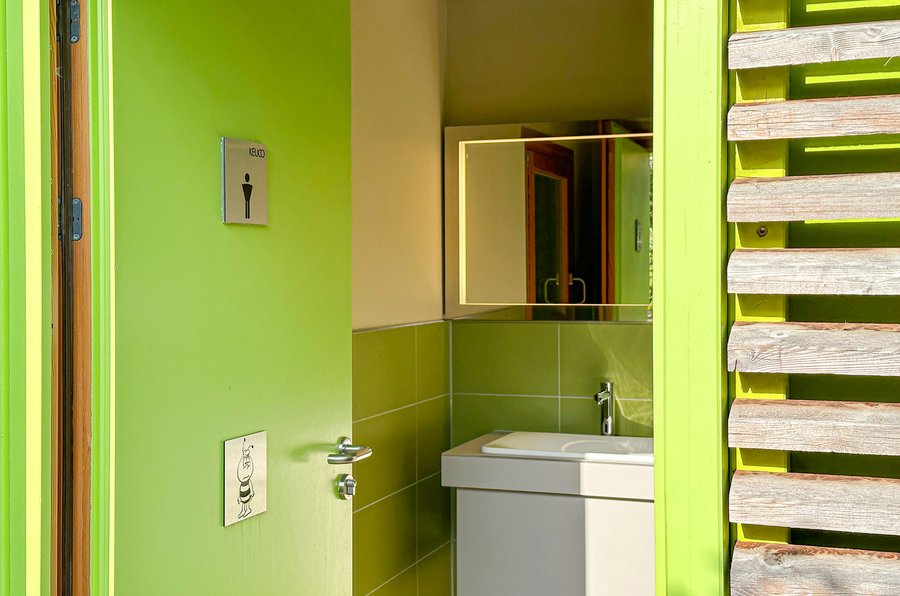 und Bilder aus der Natur. So wartet die Toilettenanlage etwa mit einem leuchtenden Blätterhimmel, Vogelgezwitscher, dem Klopfen des Spechts und dem