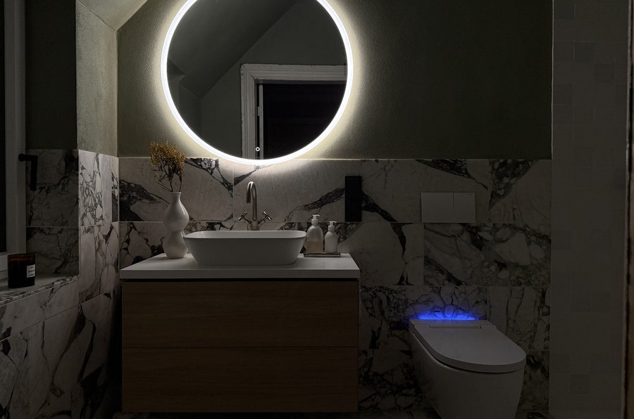 Atmosphäre im Kopf. Auf dieser Basis ist ein moderner Powder-Room entstanden,
