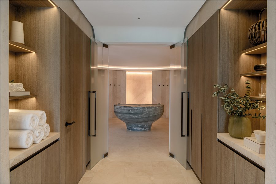 Die offen gestalteten Bäder sind geprägt von feinem Marmor, hellen Holzflächen und großen Spiegeln.