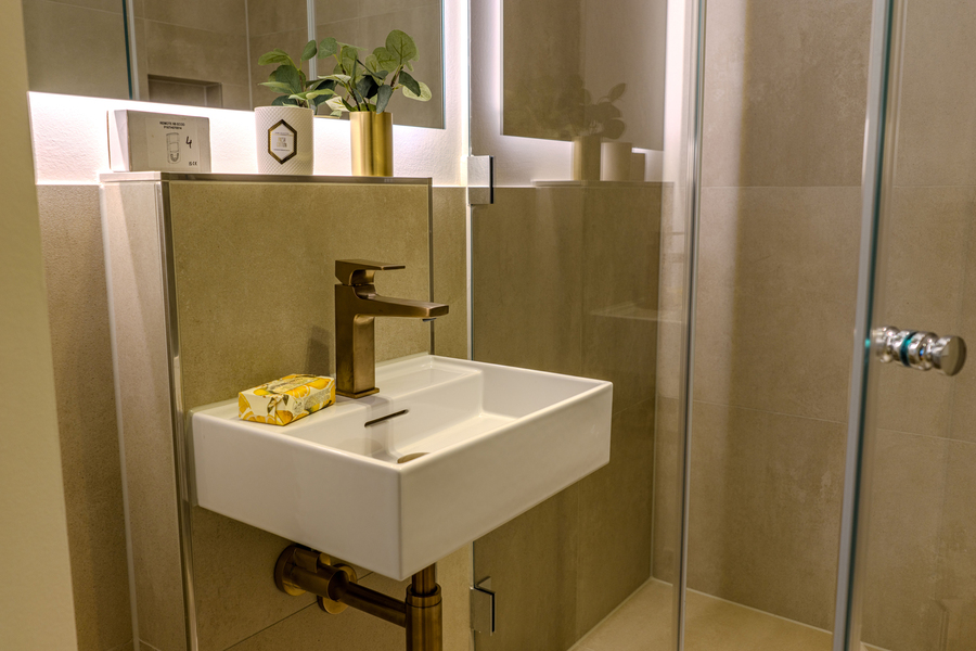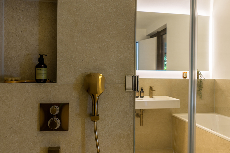Die in den Armaturen und Brausen verbaute EcoSmart-Technologie sorgt für einen geringen Wasserverbrauch und trägt so zum ganzheitlich nachhaltigem Wohnkonzept der Hamburger Stadtvilla bei.