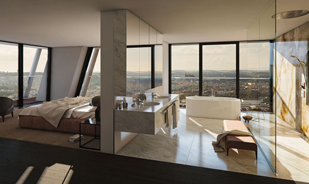 V Tower in Prag: (Bade)Zimmer mit Aussicht