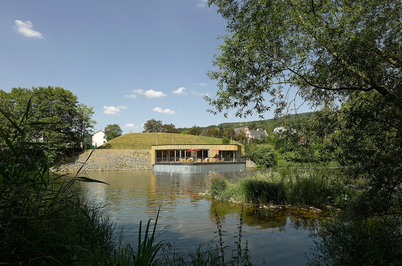 It’s the jewel of the Emser Therme sauna park: the first year-round river sauna in Germany. Located on a pontoon on the bank of the Lahn, the sauna adapts to the movements of the water and is thus the first floating river sauna. The dream of wellness on the river confronted the planners with some considerable challenges. The extreme fluctuations in the Lahn’s water level called for meticulous planning. The sauna had to be executed as a floating construction whilst nevertheless meeting the requirements of classic structural engineering.