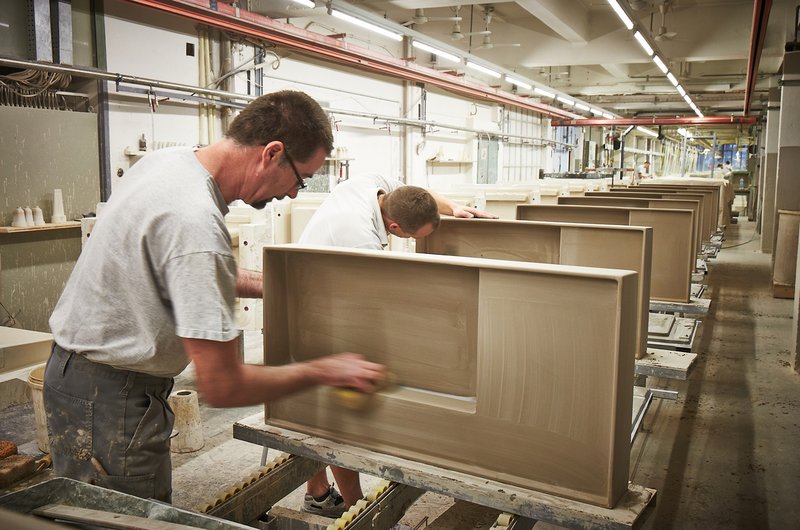 The introduction came from Toan Nguyen, and I had a meeting last October at Laufen’s HQ and one of its factories, where I met Marc Viardot, Director Marketing and Products, and Alain Reymond, Vitreous China Product Manager. It was the first time I’ve seen the production of this type of ceramic. I have some experience with ceramics — tableware for Rosenthal and Nymphenburg — but on a much smaller scale. Laufen’s products are not only bigger but produced on an industrial scale, which is very impressive. The briefing was open for interpretation, but on another level it gave a certain structure, which I think is helpful. From the start we were talking about concrete things — the material with its properties and limitations. Laufen’s technical team was very open to sharing its immensely valuable expertise with us. We agreed that we wanted to challenge things, nothing was impossible to try.