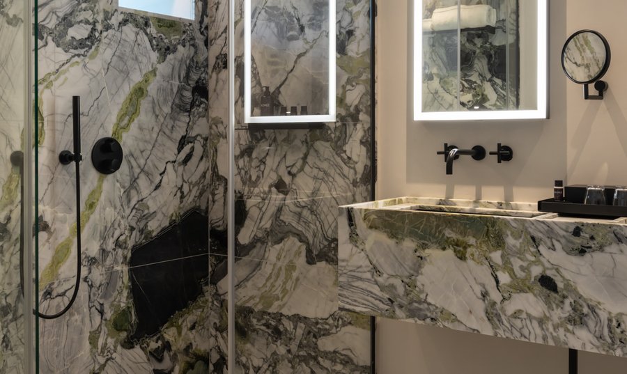 Black matt fittings and basins mesh with expressive marble in the bathrooms