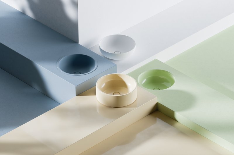 only the thickness of the material. A cylindrical countertop washbasin and a