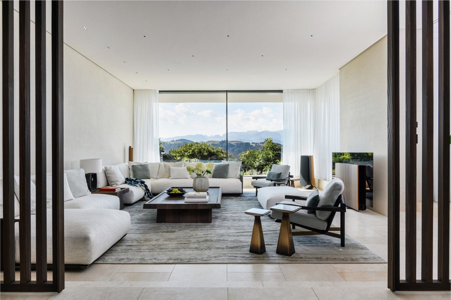 From the spacious sofa area, you can enjoy spectacular views of the Alpine landscape.