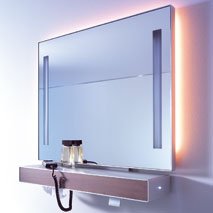 Whenever water and electricity are to be united in a bathroom setting, the German DIN standards often raise objections. Openly accessible power connections in Protected Area 1 – i.e. in the immediate vicinity of open water sources – are also considered too dangerous. For a long time, recessed loudspeakers in the ceiling and a whirlpool tub with an underwater spotlight were the only luxuries possible in the Techness Bathroom, until low-power (12V) technology added a little zest to the disharmonious relationship between water and electricity. But now it seems as if things are about to change. Setting the water temperature of electronically controlled fittings at the push of a button and storable personal shower programmes are no longer pie in the sky. Technology is entering the bathroom to make life easier for its users. The emotional staging of water and light plays an extremely important role in all this. But it is essential to keep things simple – after all, real life is hard enough as it is.