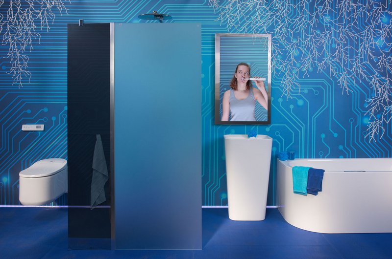In the Digital Bathroom, there’s usually more to things than meets the eye. Ceramic is ceramic and stainless steel is stainless steel, but in future all sorts of controls or sensors might be hidden away in other seemingly homogenous surfaces made of mineral cast, glass or plastic. It’s the surfaces that provide the material for potential functions. And there are plenty of them – functions that already can or soon will make the bathroom safer, more convenient and multimedia-enabled. In future, there will be far more electrical contacts behind the wall and information or pictures will be projected onto mirrors. We will wave in the direction of integrated sensors concealed in glass surfaces to activate the lighting and start programmes. Even the floor can be used not just for heating elements but for sensors too. Either hidden beneath the tiles or embedded in special mats, they can control various features or detect when somebody falls and trigger an alert.